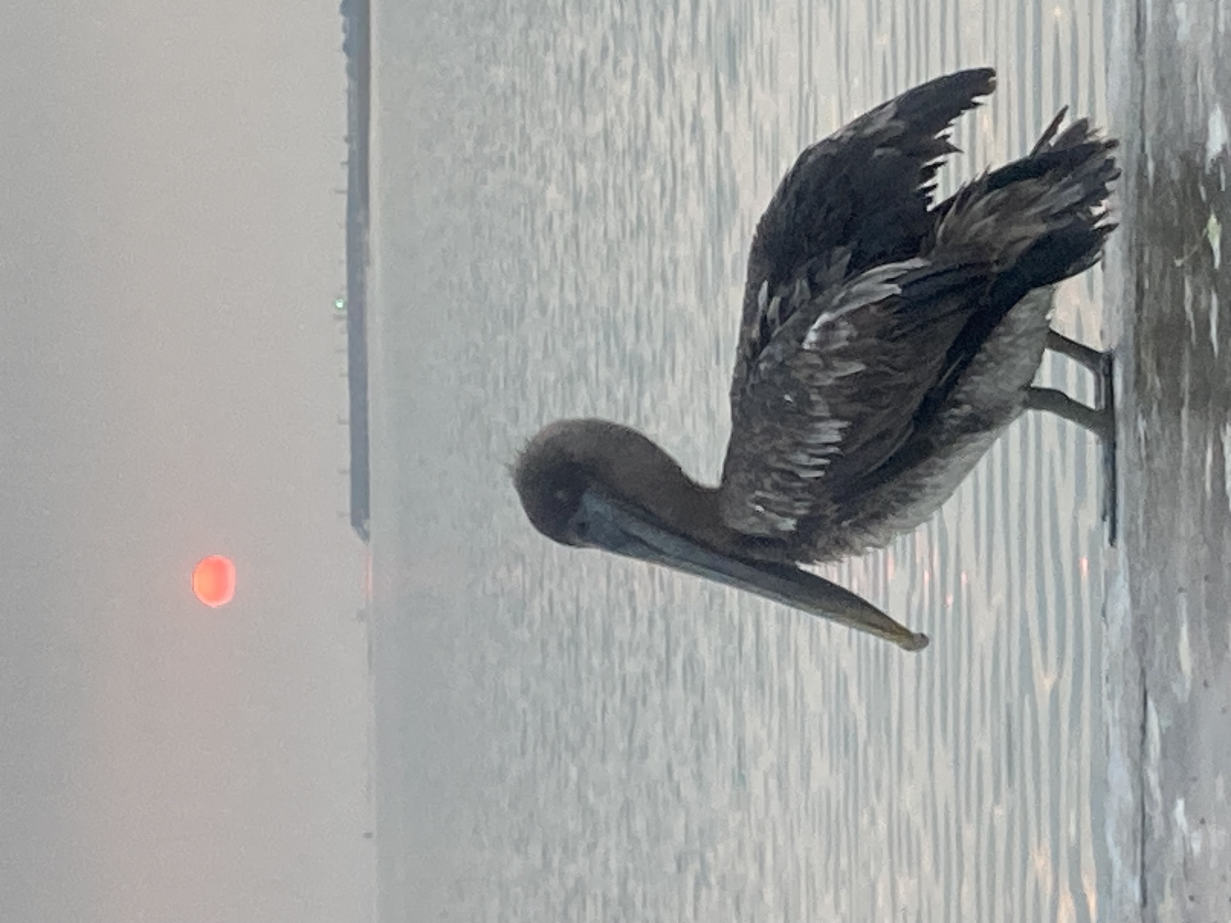 Brown pelican on the seawall waiting for the fishing report while the morning sun is trying to peek out from the morning fog